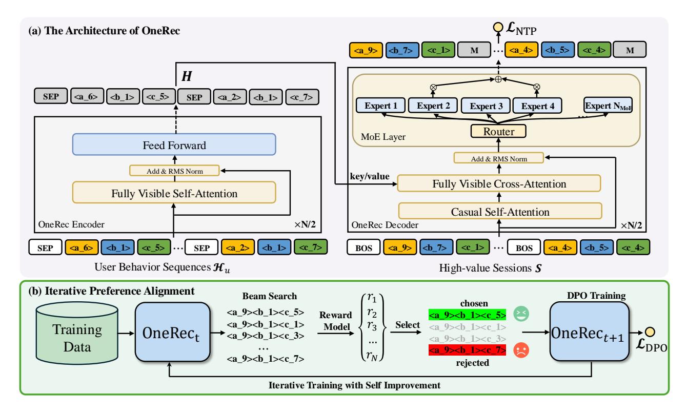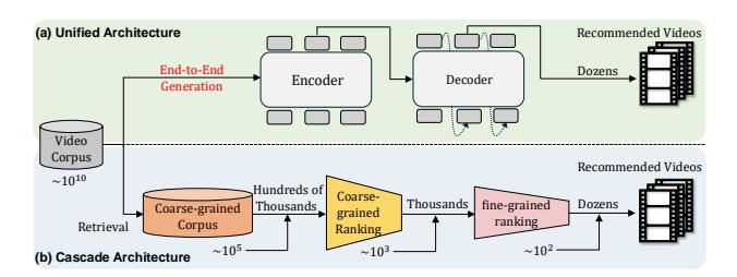 图1: (a) OneRec 统一端到端生成架构 (b) 传统级联排序系统