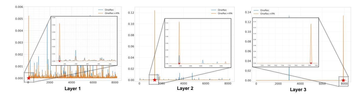 图5: 语义ID各层softmax输出概率分布。红星表示奖励最高的物品。